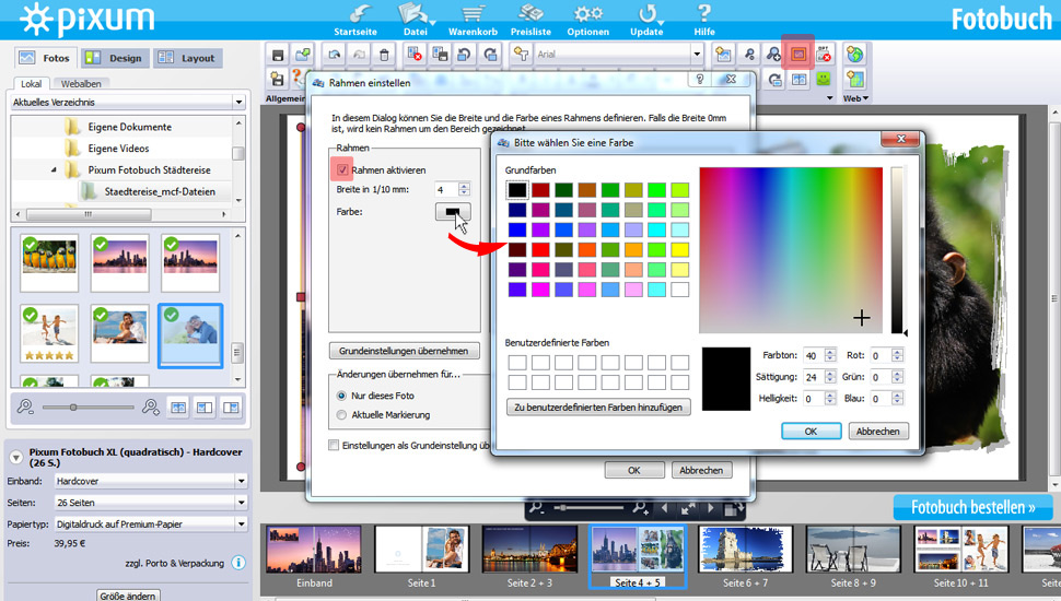 Durch einen Klick auf das Farbfeld öffnet sich ein weiteres Fenster, in dem Sie eine individuelle Rahmenfarbe festlegen können.