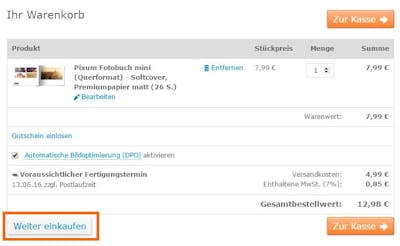 Hast du dein Fotobuch fertig gestaltet, so legst du es mit einem Klick auf die Schaltfläche oben rechts in den Warenkorb. Dort kannst du in das Eingabefeld beim jeweiligen Produkt einfach die Stückzahl ändern. Möchtest du deiner Bestellung ein weiteres Fotobuch hinzufügen oder ein anderes Pixum Produkt in bester Qualität mit eigenen Fotos gestalten, klickst du einfach auf die Schaltfläche "Weiter einkaufen".