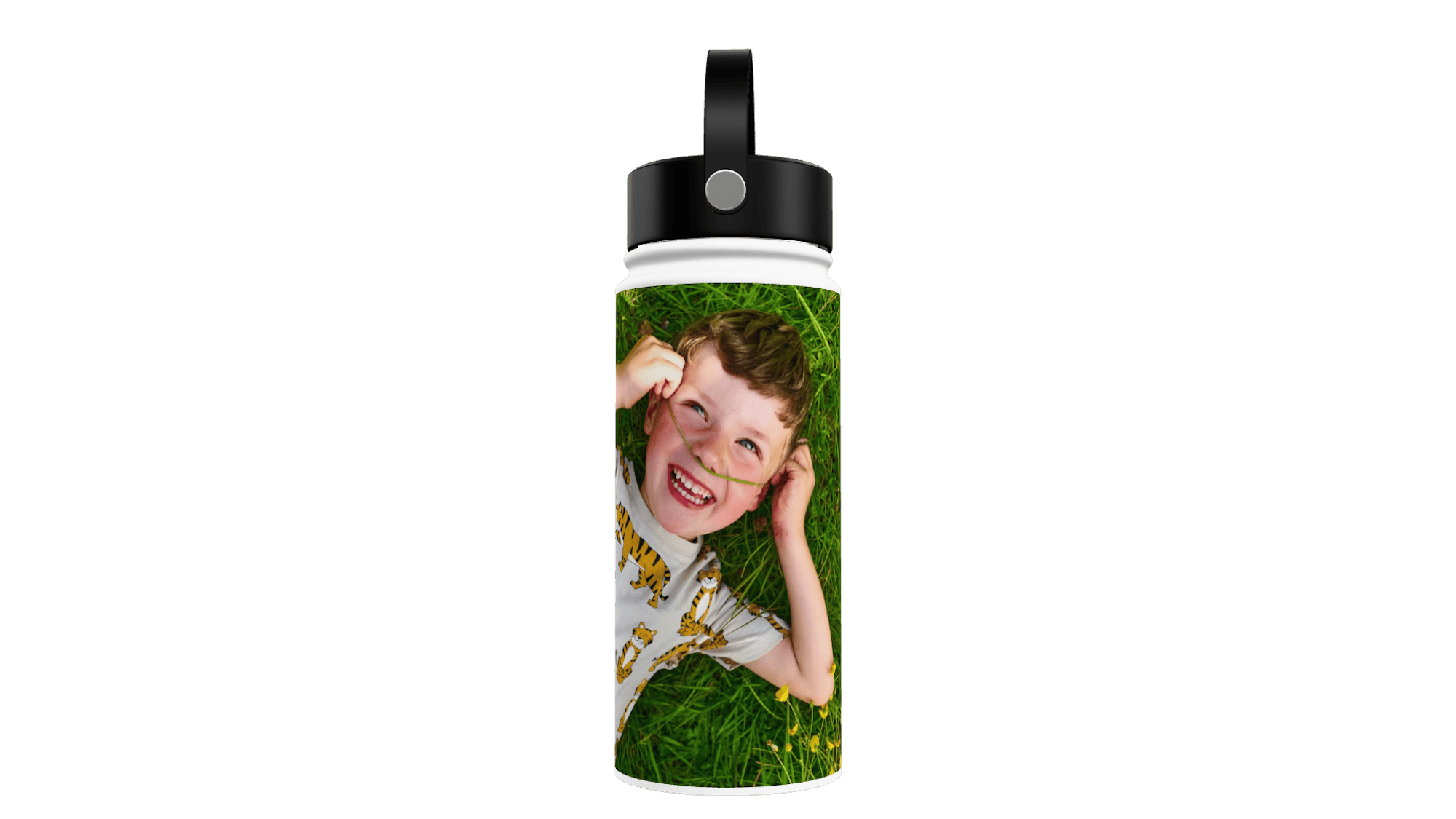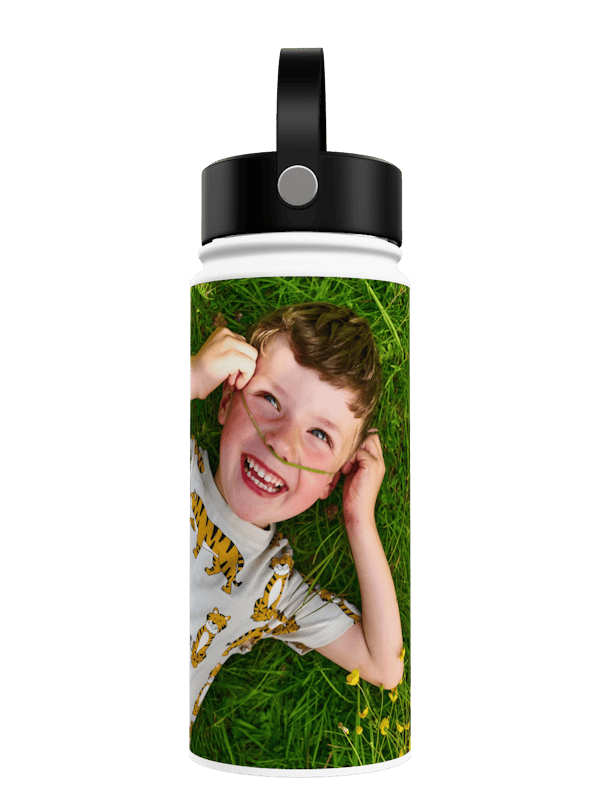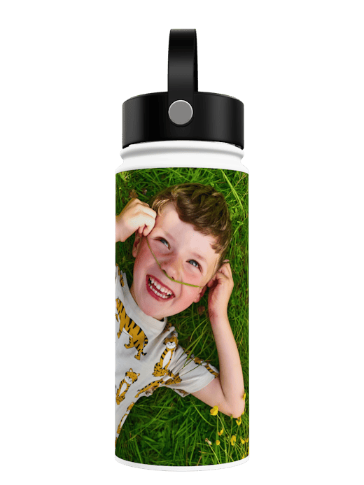 Dein Foto ist dank des Panoramadrucks auf der ganzen Trinkflasche zu sehen. Wähle vor allem kontrastreiche Bilder mit einer hohen Auflösung wie zum Beispiel Gruppenfotos von deiner Sportmannschaft, ein Landschaftsbild von deinem Lieblingsort am Strand oder in den Bergen oder erstelle eine Fotocollage aus den lustigsten Fotos mit deinen Freunden.
