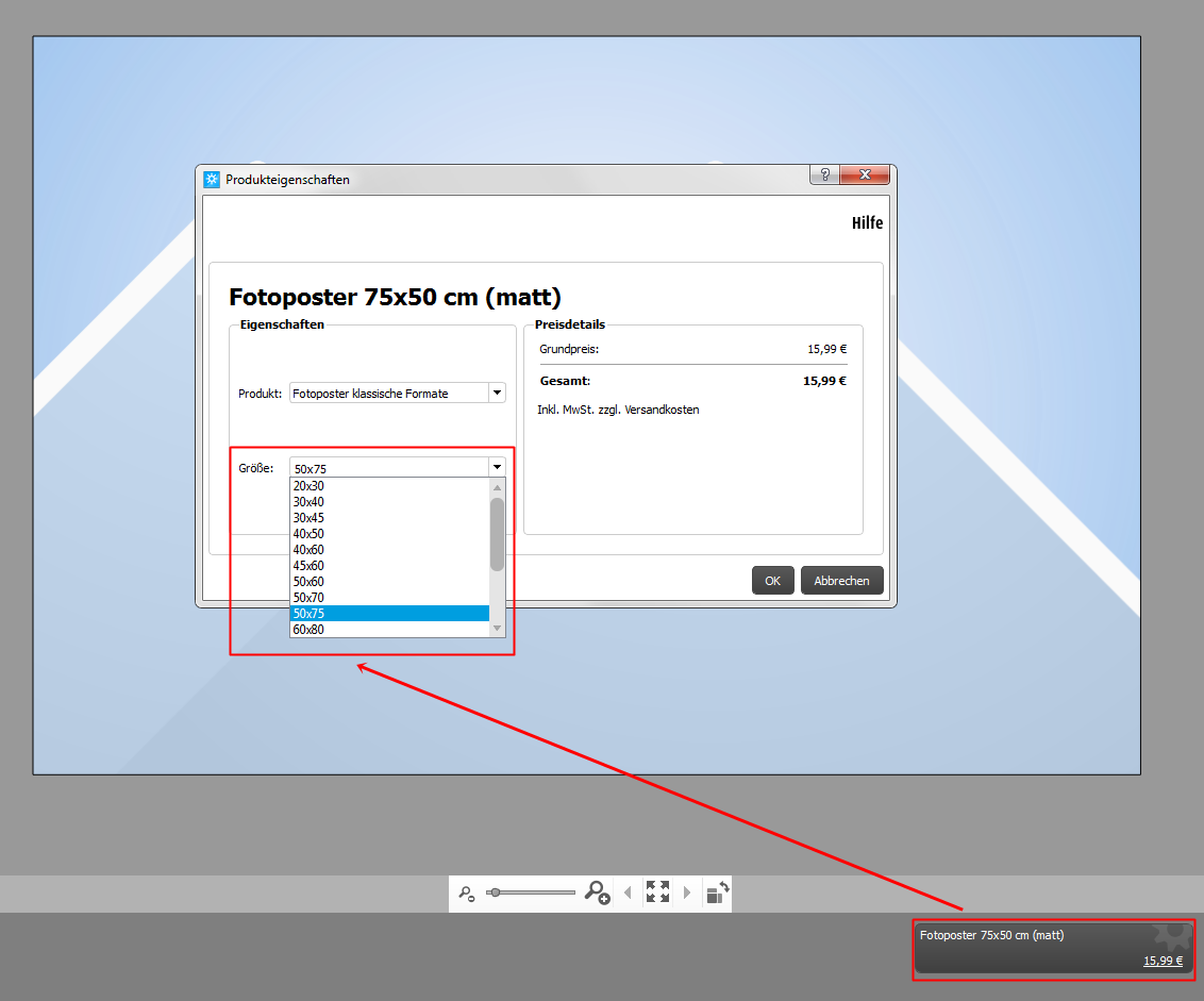 • Wird das Warndreieck zum Beispiel bei einem Poster oder einem großformatigen Fotobuch angezeigt, kannst du einfach das Format bzw. die Größe des Produkts ändern: Oft genügt die Auflösung bereits beim nächstkleineren Format (z.B. 30x45cm statt 40x60cm) für eine gute Qualität.
